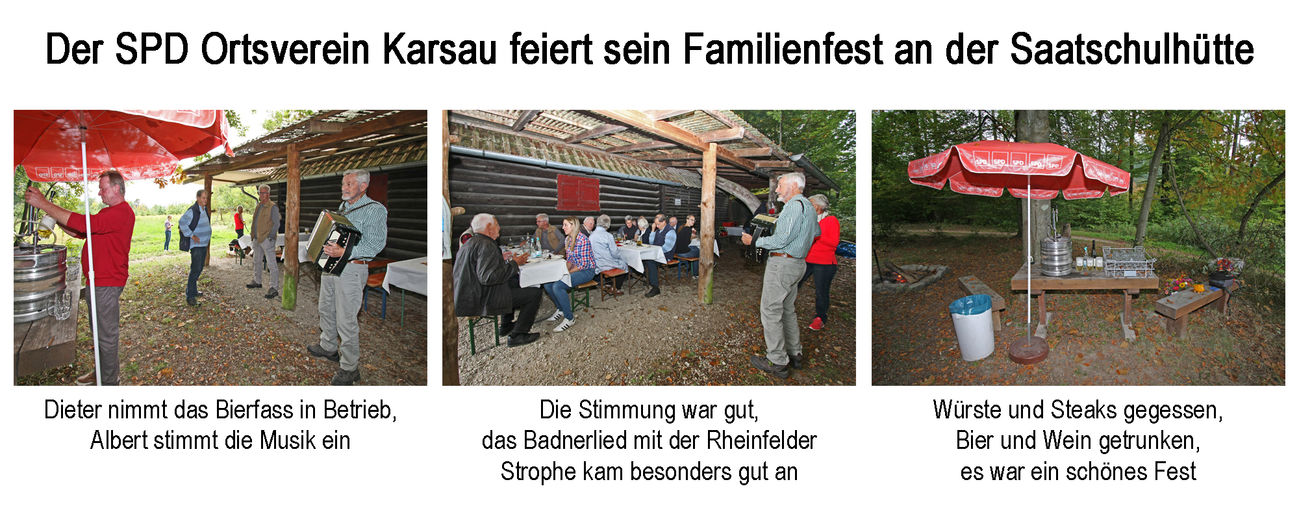 Der SPD Ortsverein Karsau feierte auch dieses Jahr sein Familienfest am 30. Sept. traditionell an der Saatschulhütte. Rita und Dieter Krause organisierten das leibliche Wohl, Grillwürste und Grillsteaks, und die Getränke. Ihnen dafür ein besonderes Lob und ganz herzlichen Dank. Und es gab auch Kaffee und Kuchen. Den Spendern Danke.