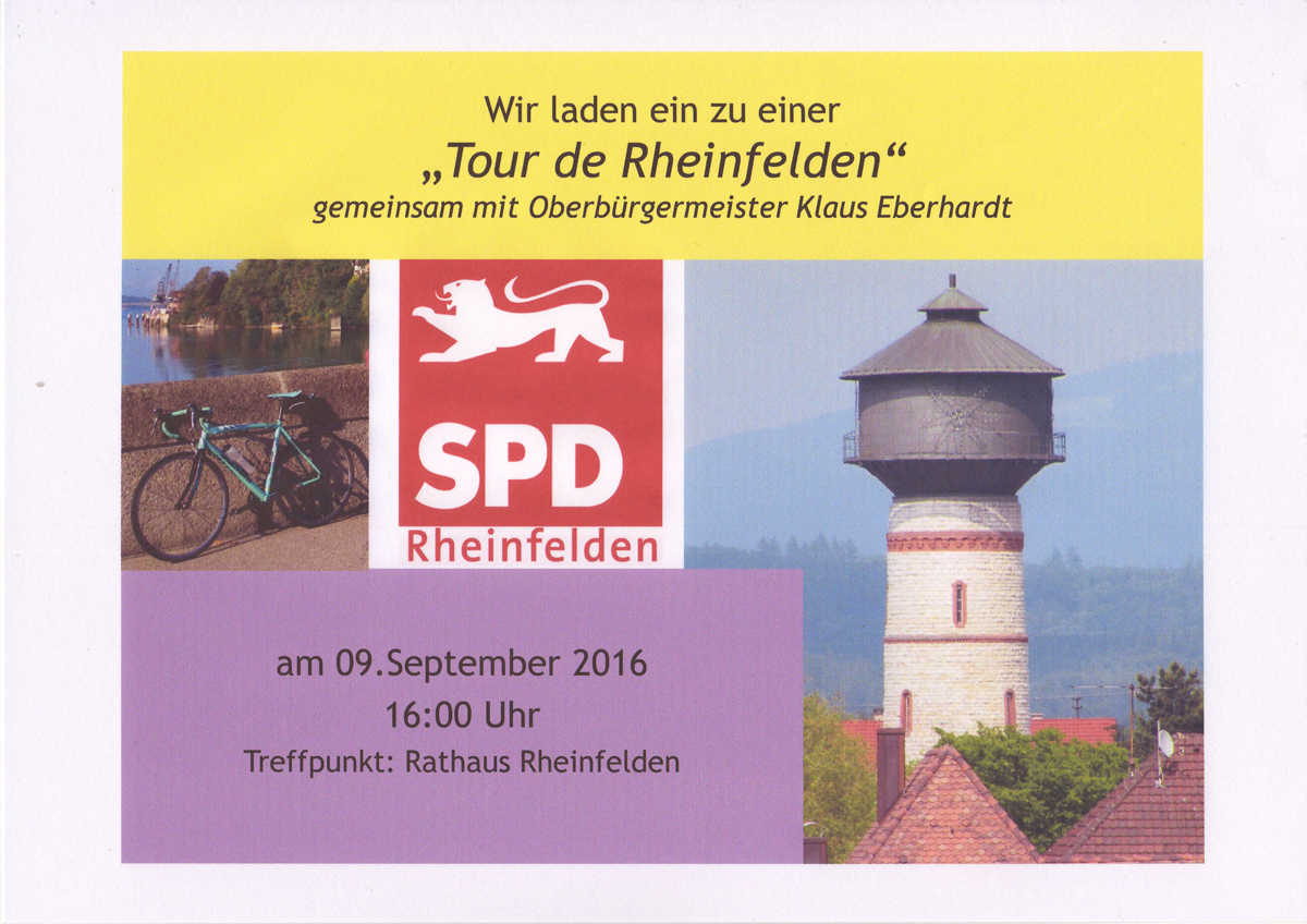 Liebe Genossinnen und Genossen, liebe Freunde, In den vergangenen Monaten hat der Gemeinderat viele Beschlüsse gefasst, die einen Beitrag zur Verbesserung der Lebensqualität hier in der Stadt leisten sollen, die auch das Stadtbild verändern werden oder auch schon verändert haben. Damit Ihr Euch ein Bild über diese Veränderungen direkt vor Ort machen zu könnt, lädt der SPD-OV Rheinfelden gemeinsam mit der SPD-Gemeinderatsfraktion am 9. September zu einer Fahrrad-Rundtour mit Oberbürgermeister Klaus Eberhardt ein. Die Tour umfasst folgende Stationen: Bürgerheim - neue Hochhäuser Goethestraße (Besichtigung) - Warmbach -Bahnhofsbereich - Salmegg - Innenstadt. Wir starten am Rathausbrunnen um 16:00 Uhr und enden ca. um 19:30 Uhr mit einem Abschlusshock im La Piazetta. Wir würden uns freuen, wenn ihr dabei sein könnt. Mit freundlichen Grüßen Karin Paulsen-Zenke, 1. Vorsitzende PS: Zur besseren Planung bitte ich um eine kurze Rückmeldung über Eure Teilnahme Mail an: wenk.rheinfelden@freenet.de (Uwe leitet die Anmeldung weiter) oder direkt an: kpaulsen-zenke@gmx.de