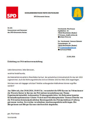 Karsau, 29.06.16:Rund 20 Besucher informierten sich am Mittwoch auf Einladung der SPD-Karsau über das Thema Schutz vor Einbruch und Diebstahl. Die Referenten Kriminalhauptkommissar Günter Welzel und Polizeihauptmeister Thomas Österlin vom Polizeipräsidium Freiburg, Prävention –kriminalpolizeiliche Beratungsstelle-, informierten über Hauseinbrüchen und sinnvolle Präventionsmaßnahmen.
